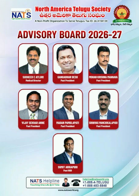NATS: ఉత్తర అమెరికా తెలుగు సంఘం (NATS) 2026-2027 కాలానికి సంబంధించి తమ నూతన బోర్డ్ ఆఫ్ డైరెక్టర్స్ (BOD), అడ్వైజరీ బోర్డ్ సభ్యుల వివరాలను అధికారికంగా ప్రకటించింది. సేవే గమ్యం అనే నినాదంతో పనిచేస్తున్న ఈ సంస్థ, అనుభవజ్ఞులైన సీనియర్లతో పాటు ఉత్సాహవంతులైన యువ నాయకత్వానికి ఈ కమిటీలో చోటు కల్పించింది.