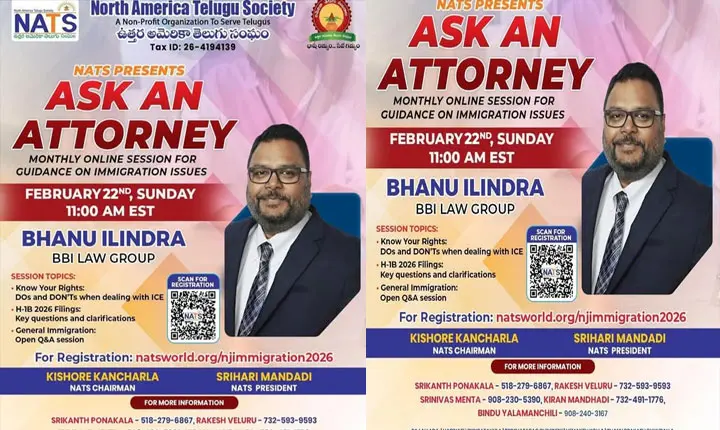 - NATS: ఇమ్మిగ్రేషన్ సందేహాలపై ‘నాట్స్’ వెబినార్.. అటార్నీ భాను ఇలింద్రతో ఆన్లైన్ సెషన్!